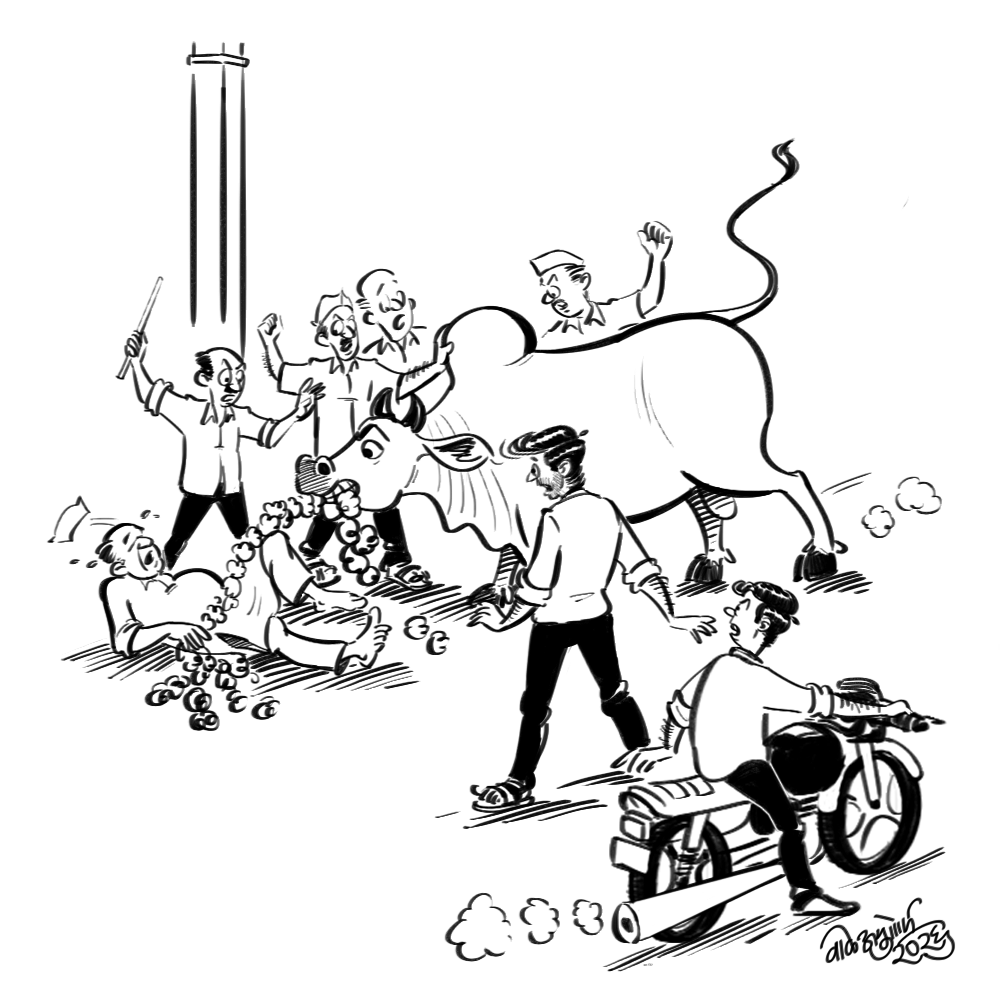‘काका वळू!’ नम्या ओरडणार तोच अर्ध्यानं मागून त्याचं तोंड दाबलं. असती एखाद्याची श्रद्धा! त्याच्यात ही मोकाट जनावरं काकांच्याच कृपेनं गावभर हिंडतात. मागं सरपंच काही अ‍ॅक्शन घ्यायचं बोलला, तर काकानं गौमाता, राष्ट्रमाता आणि बरेच चित्रविचित्र शब्द वापरून ग्रामसभेत भाषण झोडलेलं. धर्मद्रोही होण्यापेक्षा मोकाट जनावरं परवडली म्हणत सरपंचानं हात जोडलेले.