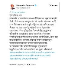 फडणवीस यांनी २० सप्टेंबर २०२३ रोजी महिला आरक्षण विधेयक मंजूर झाल्यानंतर केलेल्या ट्विटमध्ये स्वतः फडणवीस लिहितात की, ऐतिहासिक क्षण! लोकसभेने आज महिला आरक्षण विधेयकाला बहुमताने मंजुरी दिली. विधेयकाच्या बाजूने ४५४ मतं पडली. लोकसभा आणि राज्य विधानसभांमध्ये यामुळे महिलांना ३३ टक्के आरक्षण मिळेल. मा. पंतप्रधान नरेंद्र मोदीजी यांच्या नेतृत्त्वातील सरकारच्या अनेक ऐतिहासिक निर्णयांपैकी हेसुद्धा एक ऐतिहासिक पाऊल आहे. देशात रखडलेले अनेक प्रश्न निर्णयशून्यता आणि कर्तव्यशून्यतेमुळे अनिर्णित होते. आज नवा भारत सर्वसमावेशकतेच्या, सर्वांच्या समान भागीदारीतून विकासाच्या एका नव्या मार्गावर वाटचाल करतोय. मा. पंतप्रधान नरेंद्र मोदीजी यांचे खूप खूप आभार! संपूर्ण देशभरातील नारीशक्तीचेही मनःपूर्वक अभिनंदन!