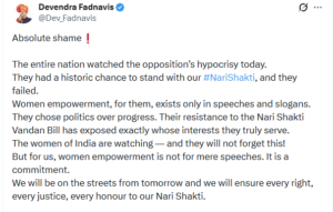 राजकीय नरेटिव्हची सुरुवात महाराष्ट्रात या शाब्दिक युद्धाला सुरुवात झाली, ती मुख्यमंत्री देवेंद्र फडणवीस आणि उपमुख्यमंत्री एकनाथ शिंदे यांनी केलेल्या ट्विटमुळे. एक्स या सोशल मीडिया प्लॅटफॉर्मवर फडणवीस लिहितात की, अत्यंत लाजीरवाणी गोष्ट! आज संपूर्ण देशाने विरोधकांचा दुटप्पीपणा पाहिला. त्यांच्याकडे आपल्या नारी शक्तीसोबत उभं राहण्याची ऐतिहासिक संधी होती आणि ते त्यात अपयशी ठरले. त्यांचं महिला सक्षमीकरण केवळ भाषणं आणि घोषणांपुरतंच मर्यादित आहे. त्यांनी प्रगतीऐवजी राजकारणाची निवड केली. नारी शक्ती वंदन विधेयकाला त्यांनी केलेल्या विरोधामुळे ते नेमकं कोणाचं हित जोपासत आहेत, हे उघड झालंय. भारतातील महिला हे सर्व पाहत आहेत आणि त्या हे कधीही विसरणार नाहीत! पण आमच्यासाठी महिला सक्षमीकरण केवळ भाषणांपुरतं नाही. ती आमची कटिबद्धता आहे. आम्ही उद्यापासून रस्त्यावर उतरू आणि आमच्या नारीशक्तीचा प्रत्येक हक्क, प्रत्येक न्याय आणि प्रत्येक सन्मान सुनिश्चित करू.