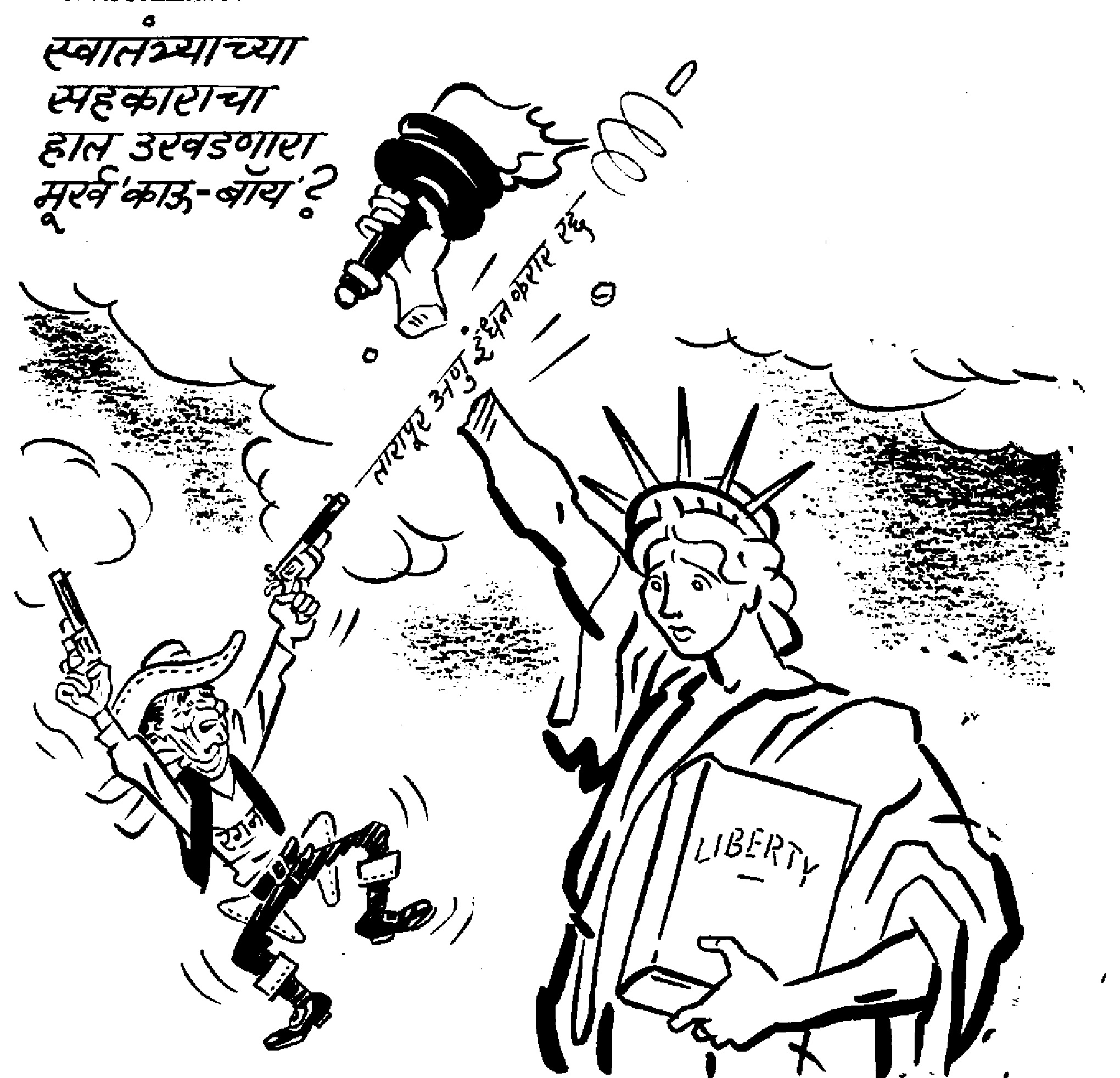 हे व्यंगचित्र आहे १९८१ सालातलं. हे वर्ष भारत-अमेरिका संबंधांमधलं एक तणावपूर्ण वर्ष होतं. हॉलिवुडमध्ये वेस्टर्नपटांमध्ये काऊबॉय साकारून नावारूपाला आलेले रोनाल्ड रीगन हे अभिनेते रिपब्लिकन पक्षातर्फे अमेरिकेच्या अध्यक्षपदापर्यंत पोहोचले होते. भारताने अणुभट्टीसाठी वापरलेल्या इंधनावर प्रक्रिया करून त्या इंधनाचा फेरवापर चालवला आहे, असा ठपका ठेवून तारापूरच्या अणुभट्टीला युरेनियमचा पुरवठाच करायचा नाही, अशी भूमिका त्यांच्या नेतृत्त्वाखालील सरकारने घेतली होती. १९७८ साली अस्तित्त्वात आलेल्या अण्वस्त्रप्रसारबंदी कराराची पूर्वलक्ष्यी पद्धतीने अंमलबजावणी करून ते भारताच्या आण्विक प्रगतीला ब्रेक लावू इच्छित होते. अणुइंधन करार रद्द करण्याचा रीगन यांचा मनसुबा जाहीर झाल्यावर संतप्त बाळासाहेबांनी त्याला बेबंद गोळीबार करणार्या थयथयाटी काऊबॉयच्या रूपात रेखाटलं आहे… त्याच्या गोळीबारात अमेरिकेची ओळख असलेल्या स्वातंत्र्यदेवीच्या पुतळ्याचा एक हात तुटतो आहे, असं चित्रण त्यांनी केलं आहे… आज अमेरिकेचे अध्यक्ष डोनाल्ड ट्रम्प यांनी जो जगभर उच्छाद माजवला आहे आणि त्यातून अमेरिकेची जी काही जगभर नालस्ती होते आहे, ती पाहिल्यावर बाळासाहेबांनी त्यांना स्वातंत्र्यदेवीचा पुतळा उखडून टाकणार्या माथेफिरूच्याच रूपात दाखवले असते कदाचित!