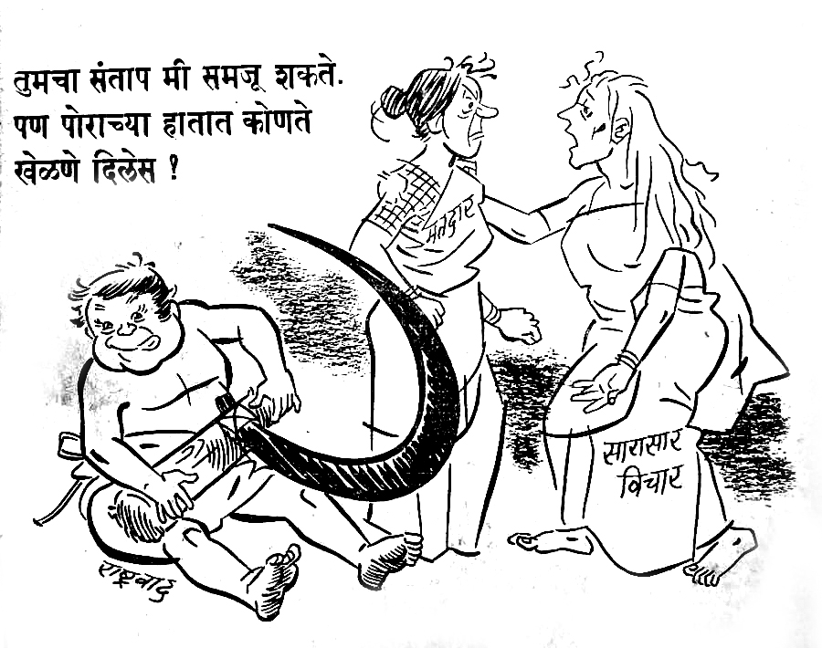बाळासाहेबांनी हे मुखपृष्ठचित्र रेखाटलं होतं २० जानेवारी १९७४च्या अंकासाठी… त्या काळात शिवसेनेचा, म्हणजे अर्थातच शिवसेनाप्रमुखांच्या मते तेव्हाचे कम्युनिस्ट नेते, त्यांचा पक्ष हे देशद्रोही होते (जगभरातले कष्टकरी एक आहेत, त्यापुढे देश दुय्यम आहेत, अशी सर्वसाधारण मांडणी होती साम्यवाद्यांची, त्यामुळे त्यांच्या राष्ट्रनिष्ठेविषयी कायम संभ्रम असायचा, तो कायम राहील, अशी त्यांची काही धोरणे असायची). त्यामुळे ते कम्युनिस्टांवर प्रखर टीका करायचे, व्यंगचित्रांमधूनही जोरदार फटकारे मारायचे. या व्यंगचित्रातही मतदारांनी राष्ट्रवादाच्या हातात विळा हे कम्युनिस्ट हत्यार दिलेलं आहे, असं चित्रण केलं आहे. त्या काळात बंगाल, केरळ, त्रिपुरा यांच्यासारखी मोजकी राज्यं सोडल्यास देशात इतरत्र कुठेही साम्यवादी विचारांना फारसा थारा नव्हता आणि त्यांचं प्राबल्यही नव्हतं. तरीही देशाला अस्थिर करणार्या आणि फुटीरतेकडे नेऊ शकणार्या विचारांना बाळासाहेबांनी तीव्र विरोध केला होता. आज देशाची संघराज्यात्मक रचना, संविधानिक रचना उद्ध्वस्त करायला निघालेल्या आणि सर्व प्रकारचा खोटेपणा करून, नीच खेळ खेळून निवडणुका जिंकून लोकशाहीच हायजॅक करायला निघालेल्या भारतीय जनता पक्षाचा कारभार पाहून बाळासाहेबांना संताप अनावर झाला असता. त्यात आपण सांगू तो देशभक्त, बाकीच्यांनी पाकिस्तानात जावे, हा खाक्या पाहिल्यावर मतदारांनी कोणत्या विद्रट कार्ट्याच्या हातात राष्ट्रवादाचे हत्यार दिले आहे, ते दाखवणारे चित्र रेखाटले असते.