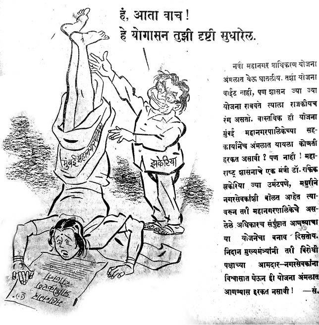 बाळासाहेबांनी रेखाटलेले हे मार्मिकचे मुखपृष्ठ आहे ७ जुलै १९७४च्या अंकावरचे. म्हणजे किमान ५१ वर्षांपूर्वीचे. त्यावेळी एक राक्षस जन्माला येतो आहे, याची चाहूल त्यांना लागली होती, आज त्या राक्षसाच्या माध्यमातून दिल्लीचा महाराक्षस मुंबईचा घास घ्यायला सज्ज झालेला असताना जागृत मराठी माणूस बाळासाहेबांच्या दूरदृष्टीला दाद देईल, पण मुंबई वाचवण्यात यशस्वी होईल का? हा मोठा प्रश्न आहे. त्यावेळच्या काँग्रेसच्या सरकारने महानगर प्राधिकरण योजना या साळसूद नावाने ही योजना महाराष्ट्रात आणली. आज तिचं नाव आहे मुंबई महानगर प्रदेश विकास प्राधिकरण अर्थात एमएमआरडीए. मुंबईसारख्या सोन्याची अंडी देणारी कोंबडी असलेल्या महानगरातल्या मराठी माणसांनी काँग्रेसची सत्ता घालवून महापालिका शिवसेनेच्या हाती सोपवली आणि दिल्लीश्वरांचा पोटशूळ जागा झाला. त्यांना मुंबई मराठी माणसांच्या ताब्यात राहणं परवडणारं नव्हतं. मग मुंबईत आणि आसपासच्या परिसरात ढवळाढवळ करण्यासाठी हे प्राधिकरण नेमण्यात आलं आणि आज अशी परिस्थिती आहे की मुंबई आणि रायगड, ठाणे, पालघर या जिल्ह्यांचा मुंबईलगतचा परिसर महाराष्ट्रात असूनही महाराष्ट्रात नसल्यात जमा आहे. यावेळच्या महापालिका निवडणुकांमध्ये या परिसरावर कब्जा करण्याचा कमळाबाईचा मनसुबा आहे, तो त्यासाठीच! ठाणे-मुंबईकरांची सुज्ञता हे मनसुबे उधळून लावू शकली तरच या परिसरातला मराठी माणूस ताठ मानेने जगू शकेल. नाहीतर शीर्षासन करायची तयारी ठेवा!