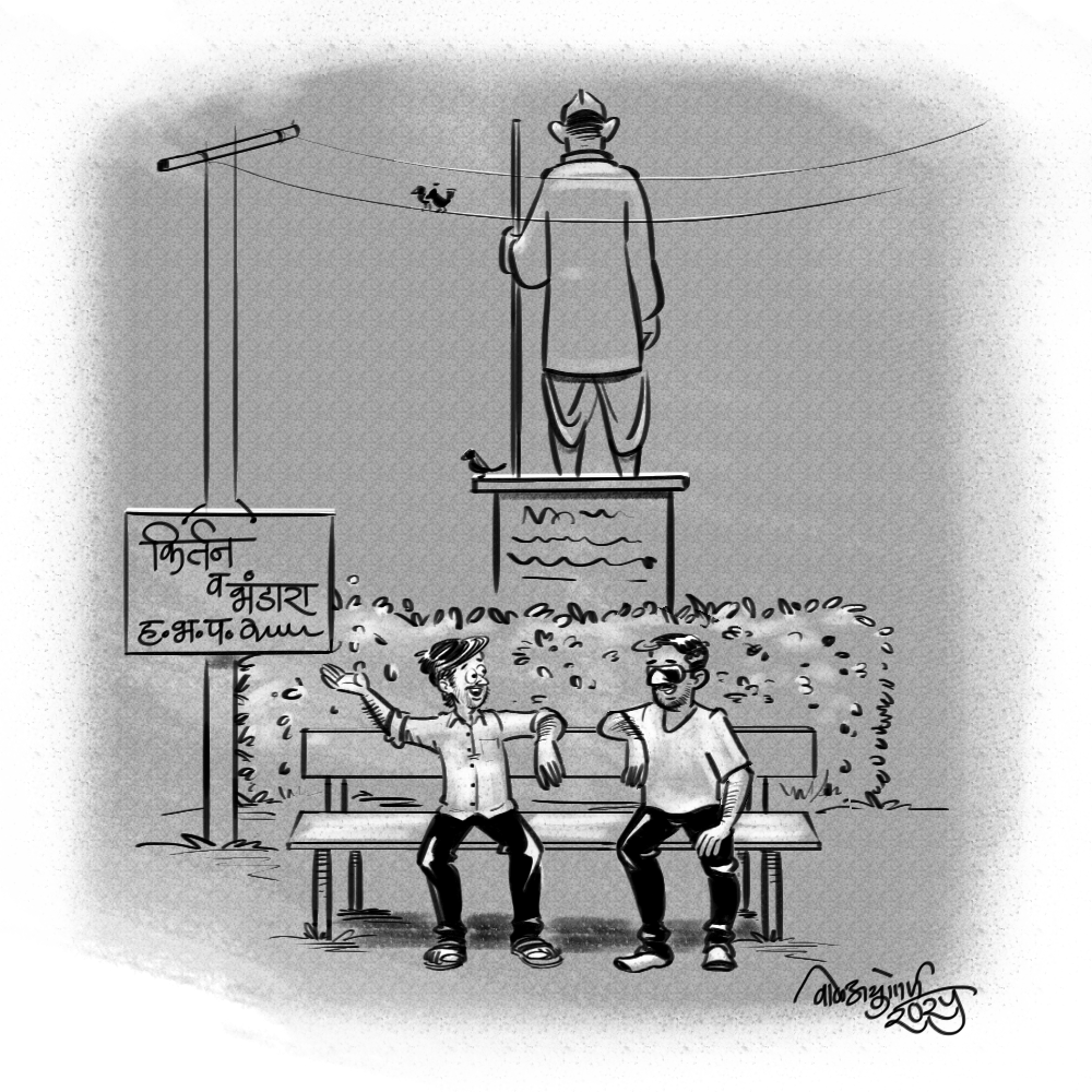 ‘चांगला होता, काम पण बरं होतं. पण त्या दिवशी स्टँडवर राडा झाला. फक्त बघायला गेलो तर मालक म्हणी, सांगून जायचं ना? आता राडे का सांगून होत्या का? आणि काय सांगायचं? समोरल्या पोरांनी बॅनरला डांबर फासलं, मला जाऊ द्याना म्हणून! अरे हाड!! आपण कट्टर कार्यकर्ते भैय्यासाहेबांचे! कोणी हुं केलं की आपण सगळ्यात आधी उत्तर द्यायला त्याच्यापुढं उभं राहतो. आपल्यासाठी भैय्यासाहेब आणि पॉलिटिक्स इम्पॉर्टंट. बाकी अश्या छपन्न नोकर्‍या ववाळून टाकू आपण, ह्याच्यावरून… बाकड्यावर धूळ नाही ना? बसू का?’ विचारत चिन्या ऐटीत बसतो. याच्या बुडाला आताशी कळ लागली वाटतं!